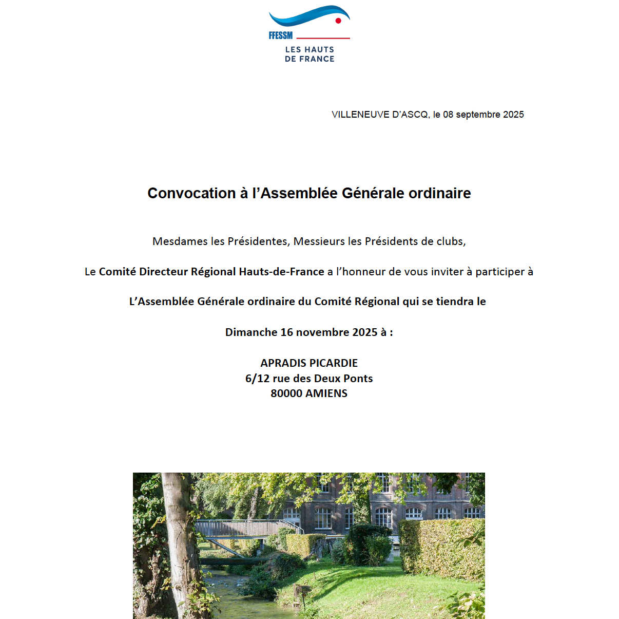 le Comité Directeur Régional Hauts-de-France a l’honneur de vous inviter à participer à L’Assemblée Générale ordinaire du Comité Régional qui se tiendra le Dimanche 16 novembre 2025 à AMIENS